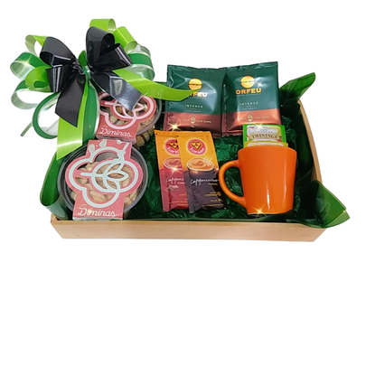 Bandeja hora do café especialmente elaborada para os amantes de um bom café. Composta por uma linda caneca, sachês com café coado, cappuccinos, chás e deliciosos biscoitinhos para acompanhar.