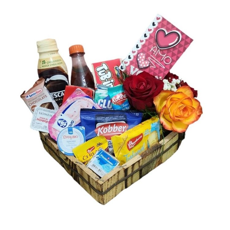Cesta de Café da Manhã Coração Apaixonado - Deliciosa Cesta de Café da Manhã acomponhada de um arranjo de rosas coloridas.