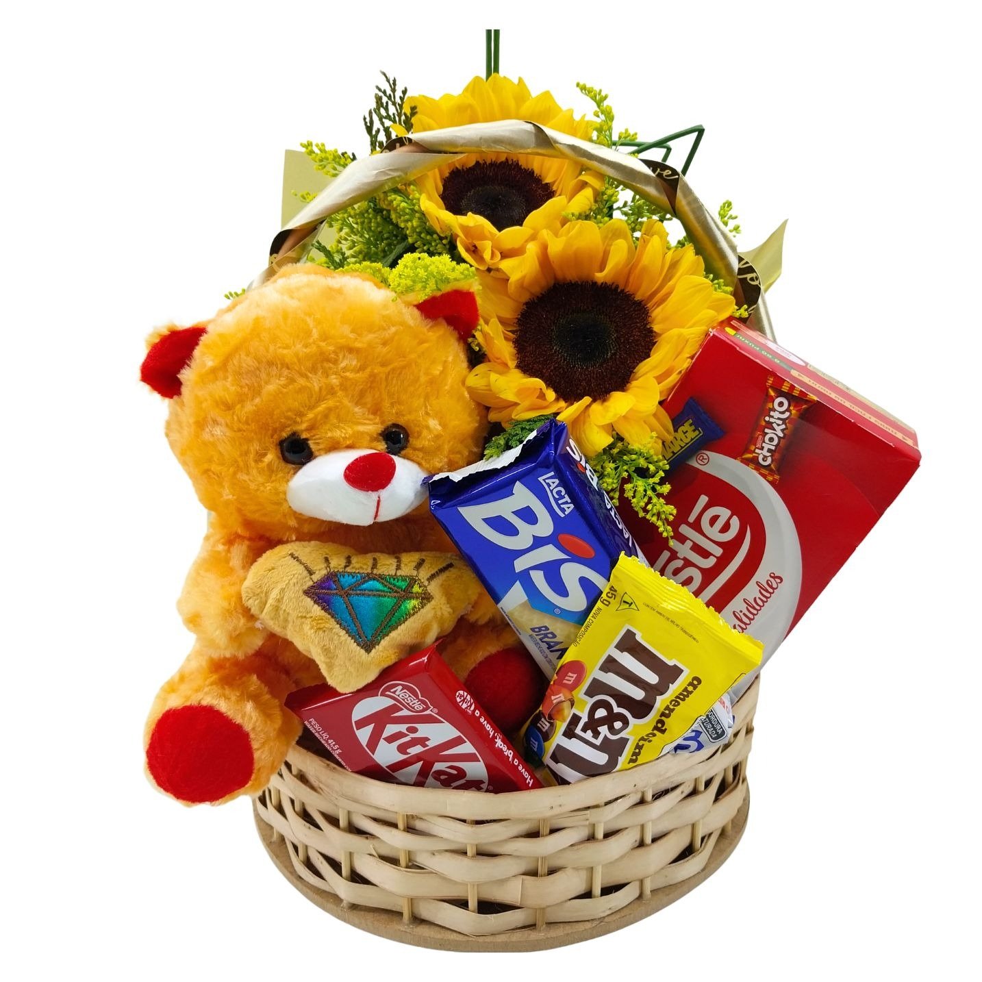 DESCRIÇÃO:Linda Cesta de presenteCOMPOSIÇÃO:1x Cesta de 25 cm1x Arranjo de Girassóis1x Caixa de bombom1x Kit Kat 41g1x M&M 35g1x Caixa de Bis1x Pelúcia de 20 cmDETALHES:PERSONALIZE SEU PRESENTEApós selecionar a data e período de entrega você poderá escolher os melhores complementos para o seu presente como pelúcias, chocolates, bebidas entre outros itens para deixar o seu presente ainda mais perfeito.CARTÃO:É possível incluir uma mensagem junto ao seu presente! Prossiga com a compra e na tela de "ENTREGA" basta escolher o cartão e escrever a mensagem. Caso queira enviar em Anônimo, escolha a opção "NÃO QUERO CARTÃO". ENTREGA E FRETE:Para consultar o prazo e valor de entrega, preencha o CEP de entrega, clique em OK e verifique as opções disponíveis. Caso queira acompanhar a entrega do seu presente, informe o seu número do celular. IMPORTANTENós trabalhamos com lojas parceiras por todo o Brasil que possuem treinamento, experiência e materiais para manter a qualidade exigida.Porém, devido às características de cada local, variações naturais das flores e outras interferências, os produtos podem sofrer alterações.As imagens exibidas são meramente ilustrativas