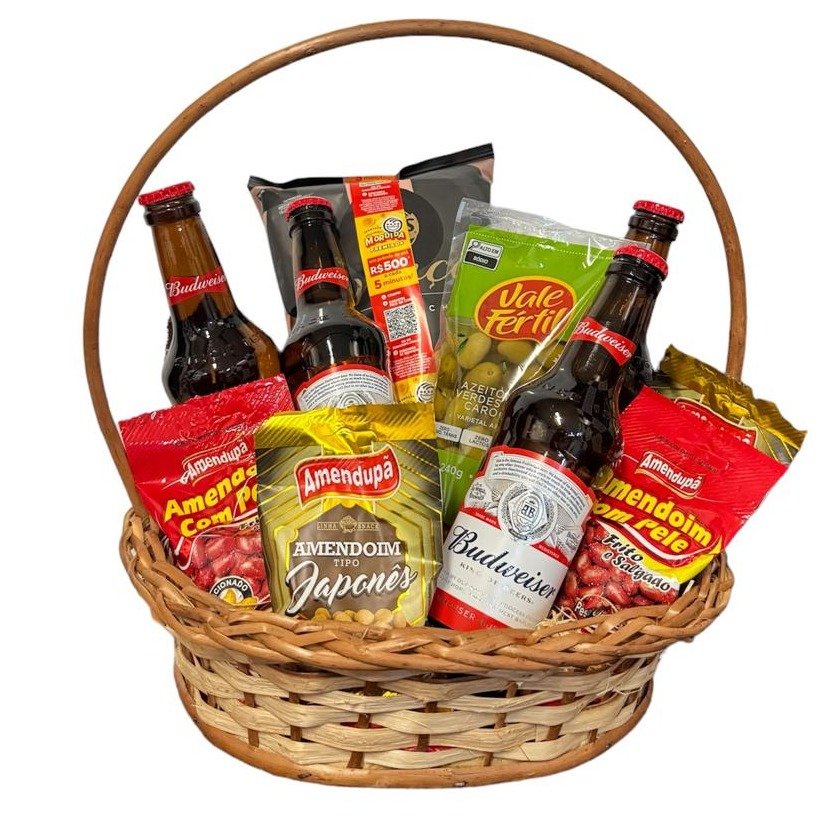 Cesta de cervejas e aperitivos, ideal para presentear aquela pessoa que gosta de um happy hour.