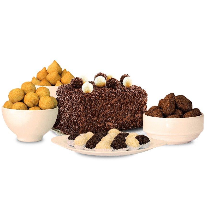 0,500KG de bolo da linha tradicional (massa de chocolate, recheio de brigadeiro e beijinho, cobertura de trufado de chocolate preto, chocolate granulado, beijinhos e brigadeiros) 28 unid. de salgados (fritos e assados) 12 docinhos (brigadeiro/beijinho) 1 refrigerante 350ml 1 vela simples cartão presente