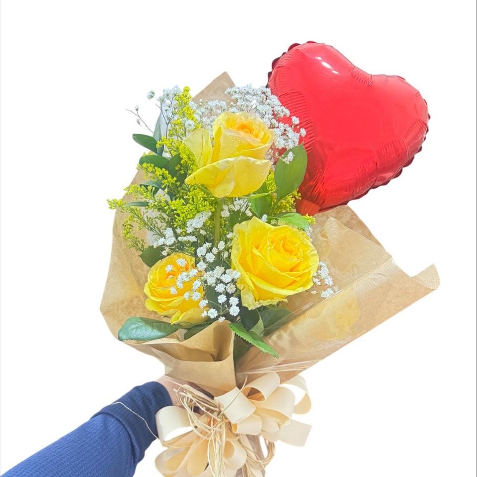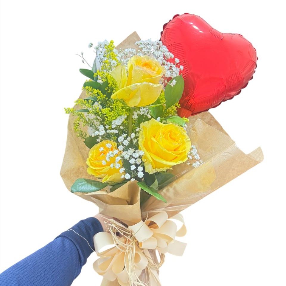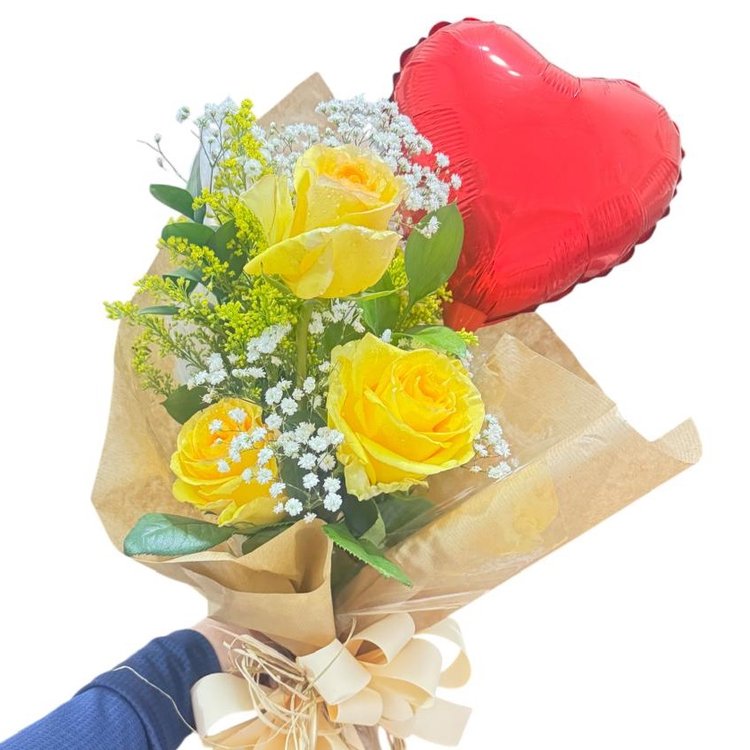 Descrição:Lindo conjunto de rosas amarelas com lindas folhagens e balão de coração para acompanhar.COMPOSIÇÃO:- 3 Rosas amarelas- 2 folhagens de ruscus- 2 galhos de gispsofila -1 Balão de coração pequenoDETALHES:PERSONALIZE SEU PRESENTEApós selecionar a data e período de entrega você poderá escolher os melhores complementos para o seu presente como pelúcias, chocolates, bebidas entre outros itens para deixar o seu presente ainda mais perfeito.CARTÃO:É possível incluir uma mensagem junto ao seu presente! Prossiga com a compra e na tela de "ENTREGA" basta escolher o cartão e escrever a mensagem. Caso queira enviar em Anônimo, escolha a opção "NÃO QUERO CARTÃO". ENTREGA E FRETE:Para consultar o prazo e valor de entrega, preencha o CEP de entrega, clique em OK e verifique as opções disponíveis. Caso queira acompanhar a entrega do seu presente, informe o seu número do celular. IMPORTANTENós trabalhamos com lojas parceiras por todo o Brasil que possuem treinamento, experiência e materiais para manter a qualidade exigida.Porém, devido às características de cada local, variações naturais das flores e outras interferências, os produtos podem sofrer alterações.As imagens exibidas são meramente ilustrativas