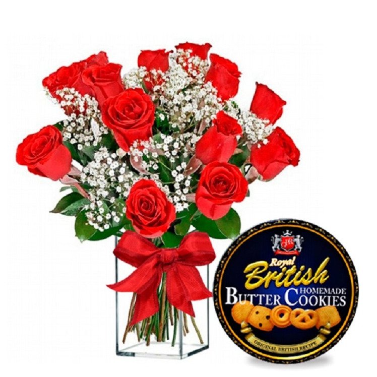 Vaso 12 Luxuosas Rosas Exportação, vaso em vidro elaborado com 12 Rosas Exportação Vermelhas, Chuva de Prata Branca (Gypsophila) e lindo laço em fitas de cetim cor vermelha. Acompanha Royal British Butter Cookies, 114g. Embalagem especial em exclusiva lata decorada.
